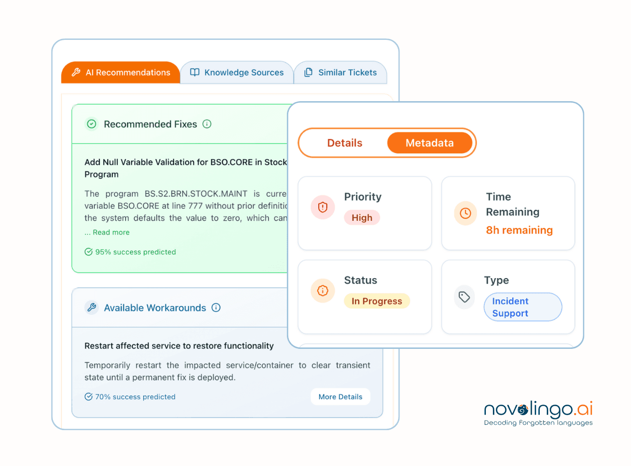 Stop firefighting legacy incidents manually. Our AI extracts embedded business logic to auto-generate fixes and test scripts, cutting resolution time by 50%+ while your team focuses on innovation, not maintenance.