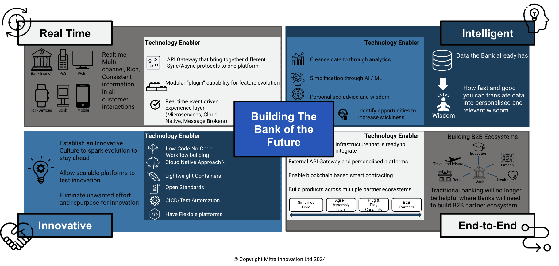 For example if you are a bank that wants to jump from the Basic stage to Mature or even the Innovative stage we can definitely help you do that in the most efficient way possible and avoid you from some common pitfalls that would waste your banks time, money and effort.