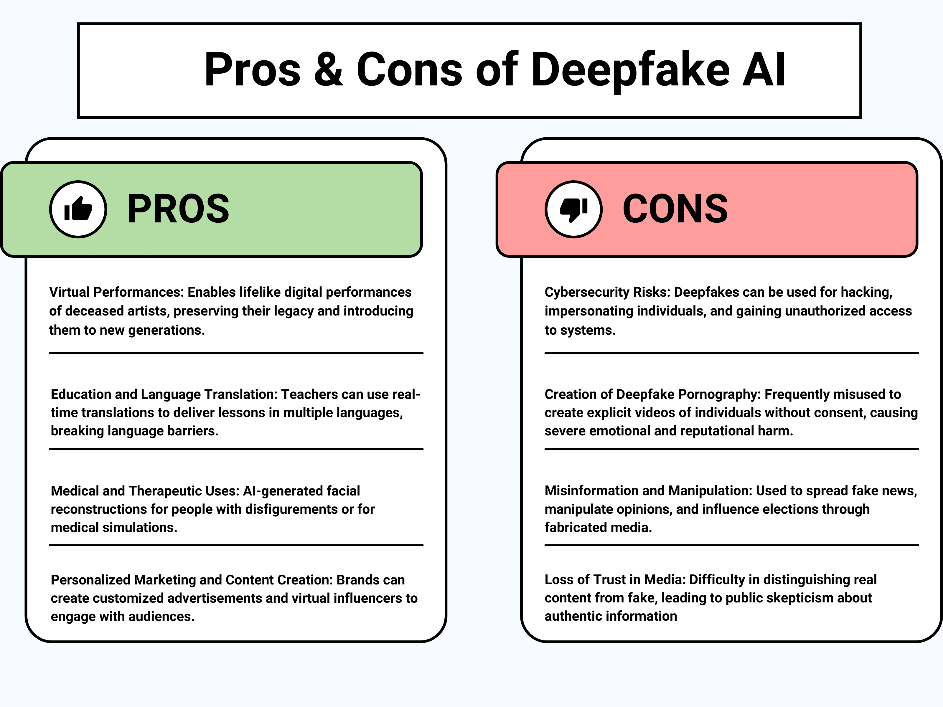 In conclusion, while deepfake AI technology offers innovative possibilities, it also presents significant ethical and societal challenges. History shows that with every disruptive technology, initial fears often give way to eventual understanding and utility. People may fear that deepfakes will destroy the future, but as regulations evolve and awareness grows, society will likely find ways to benefit from this technology responsibly. Balancing the benefits with the need to protect individuals is essential. Ongoing efforts in detection, regulation, and public awareness are critical to mitigating the risks associated with deepfakes and ensuring that this technology is used ethically and responsibly. As the future unfolds, it promises to be both weird and wonderful, with deepfake technology serving as a double-edged sword that must be wielded with care.